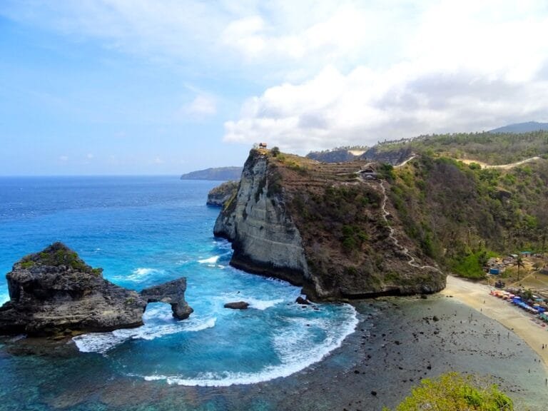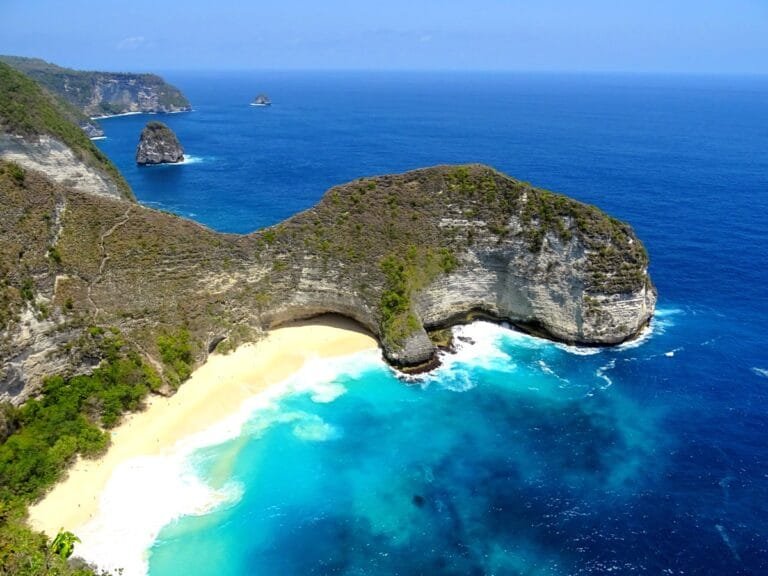 Snad nejznámější místo na Nusa Penida, Kelingking Beach, je proslulé útesem připomínajícím tvar T-rexe. Vyhlídka shora nabízí úžasný panoramatický výhled na tyrkysová voda dole. Pro dobrodruhy vede strmá stezka až dolů na samotnou pláž, která je jednou z nejkrásnějších a nejodlehlejších na Bali. Sestup je náročný, ale odměnou je opravdový ráj.
