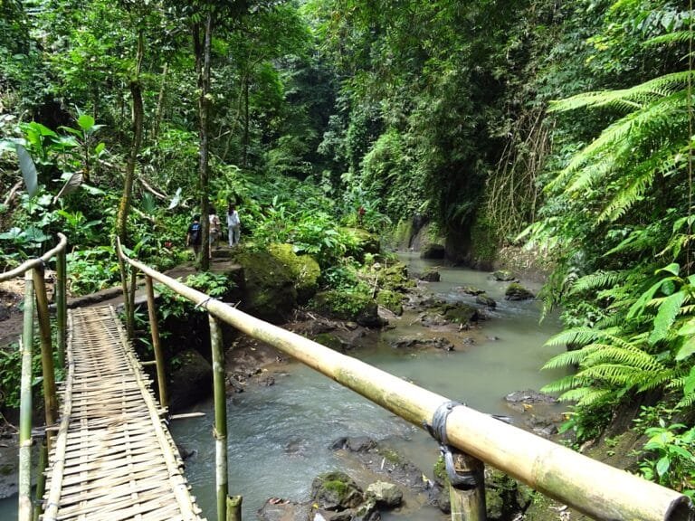 Cesta k Tibumana Waterfall je krátká, ale příjemná procházka balijskou tropickou krajinou. Začíná na parkovišti a trvá asi 10–15 minut. Stezka je dobře značená a snadno průchozí – vede bambusovými háji, kolem rýžových polí a přes malé říčky. Cestou přejdeš i několik dřevěných mostků a naskytnou se ti krásné výhledy na okolní džungli.